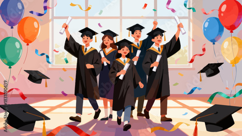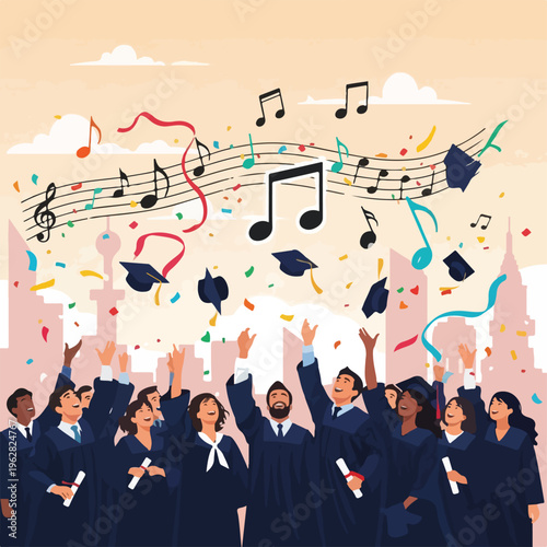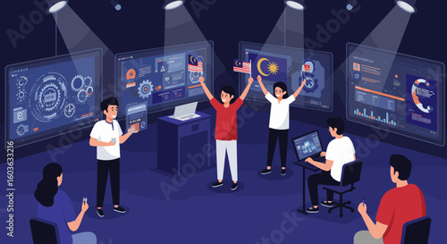 Nový rok a vánoční večírek v kanceláři koncept vektorové ilustrace. Šťastný obchodní tým Oslavte vánoční svátky tancem a šampaňským. Kancelářské postavy ve vánočních čepicích.