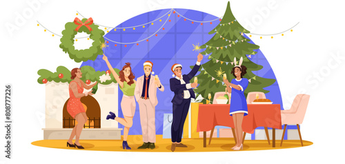 Micro mužské a ženské postavy zdobení krb s vánoční věnec, punčochy, svíčky a přípravu dárků, vektorové ilustrace. Vánoce a Nový rok oslava koncept.