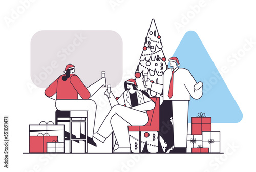 Lidé zdobí vánoční stromeček a připravují dárky, vektorové ilustrace. Nový rok firemní party oslava koncept pro web banner, webové stránky atd.