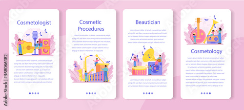 Noční klub dj dance disco party. Šťastní Tančící lidé, dj hudba, chutné alkoholické koktejly, ovládání obličeje. Obrazovky mobilních aplikací. Vektorové banner šablony pro webové stránky a mobilní vývoj.