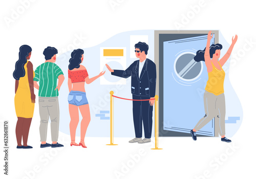 Noční klub ovládání obličeje bezpečnostní služba vektorové ilustrace. Guard man osoba zvoucí hosta, kontrolní seznam a vstupenky u vchodu do dveří