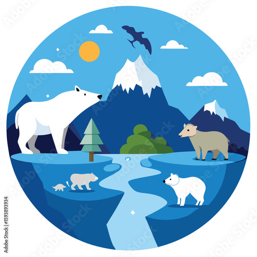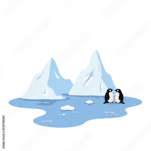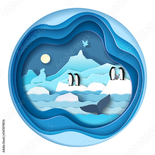 Severní tučňák na ledu v Antarktidě vektor. Ledovec ledovec s divokým zvířetem v papíru cut 3D craft art banner. Cestovní expedice, věda a koncepce životního prostředí