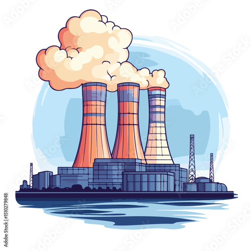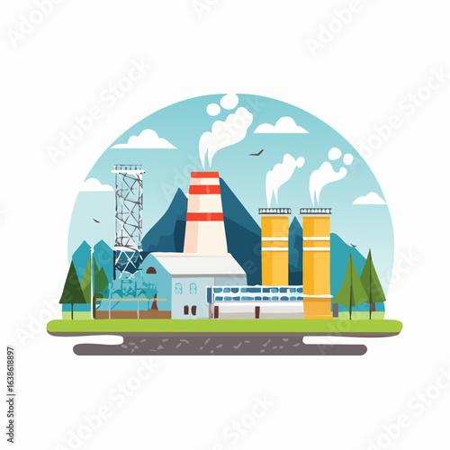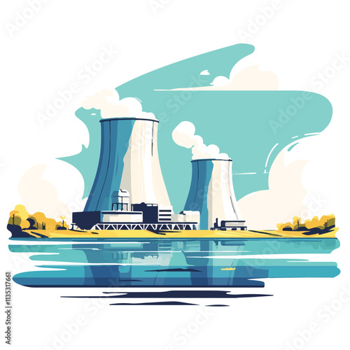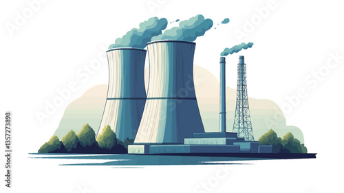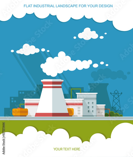 Jaderná elektrárna a továrna. Průmyslová koncepce jaderné energetiky. Vektorové ilustrace v plochém stylu. Zázemí jaderné stanice.