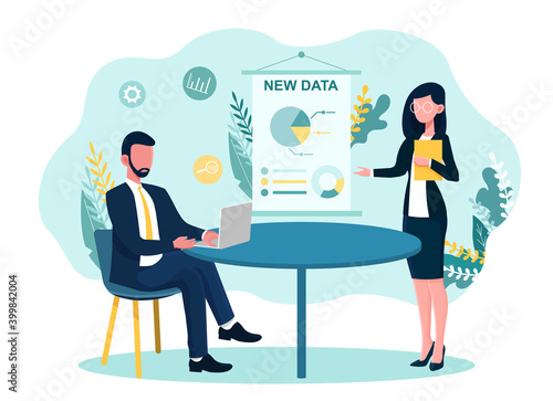 Odborník na výživu koncept vektorové ploché ilustrace. Žena postava s štíhlým pasem na velkém monitoru počítače, drobné postavy dietolog dává jablko ženě dělat těsto, muž se švihadlem. Zdravý