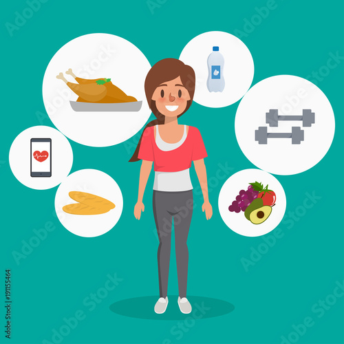 Obezita a problémy s hmotností. Mladá žena si vybírá mezi zdravým a nezdravým jídlem, ploché vektorové ilustrace. Hubnutí a zdravý životní styl. Nezdravé jídlo vs zdravé vyvážené menu.