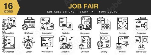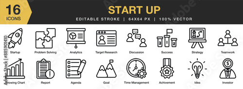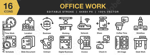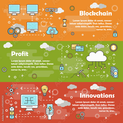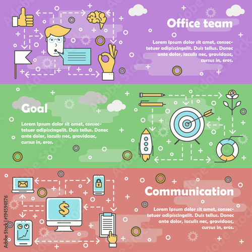 Vektorová sada horizontálních bannerů s prezentačními, strategickými a kancelářskými prvky moderního liniového umění plochého stylu, webové šablony.