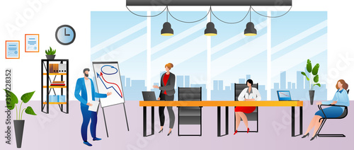 Vektorová sada kancelářských interiérů a konceptů podnikatelů, bannery v plochém stylu. Manažer, administrativní pracovníci na pracovišti, prezentace, konference, dodávka vody konstrukční prvky.