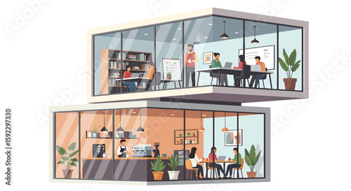 Vektorová ilustrace podnikatelů a moderního interiéru pracovního prostoru s nábytkem, výpočetní technikou a kancelářskými potřebami. Koncept kancelářského života, design plochého stylu.