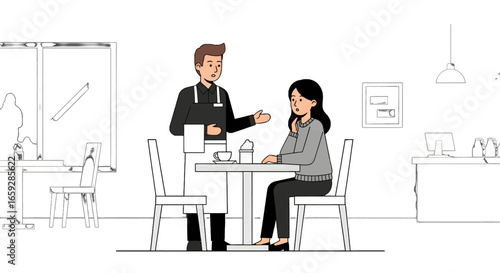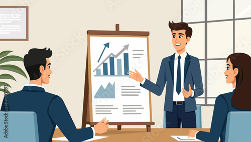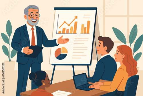 Koncept konference vektorové ilustrace. Podnikatelka ukazuje graf. Kancelářští lidé se setkávají s prvky designu plochého stylu, ikony izolované na bílém pozadí.