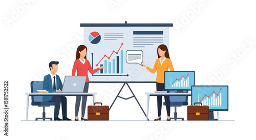 Miniaturní mužské postavy kancelářské lidi stavební palubní deska, chůze na pracoviště na obrovské obrazovce notebooku, vektorová plochá ilustrace. Analýza dat, obchodní analytika, kancelářské situace a každodenní rutina