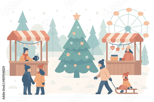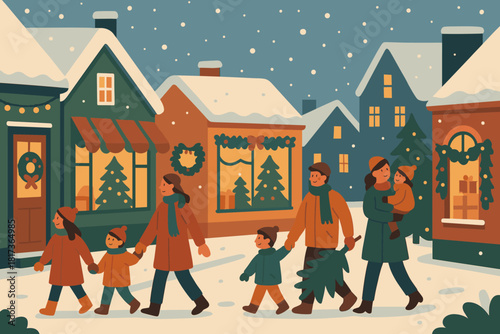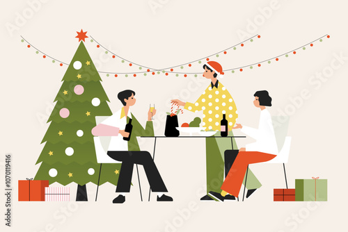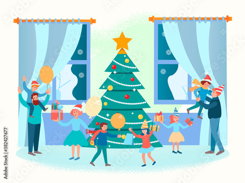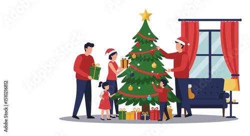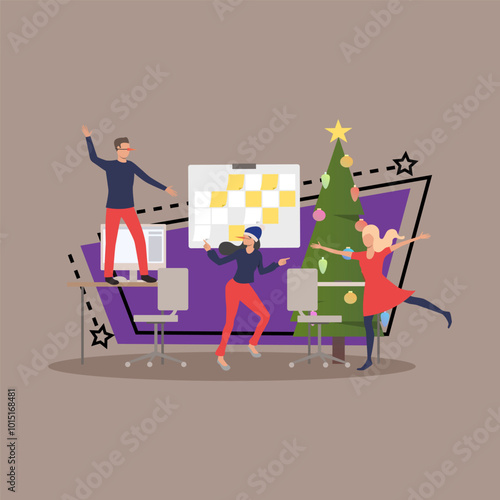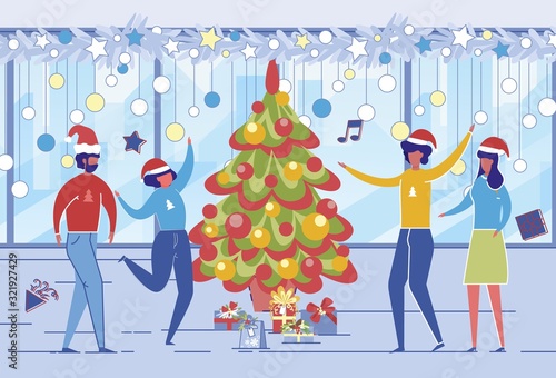 Drobní kancelářští lidé zdobí obří vánoční stromek a připravují dárky, aby je dali pod stromeček, plochá vektorová ilustrace. Příprava na Veselé Vánoce a novoroční svátky party oslava.