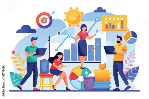 Malé postavy, kancelářské lidé balení obrovský kufřík s cílem, ozubené kolo, žárovka, grafy, palec nahoru, e-mailové zprávy symboly, ploché vektorové ilustrace. Business office pracovní zkušenosti koncept.