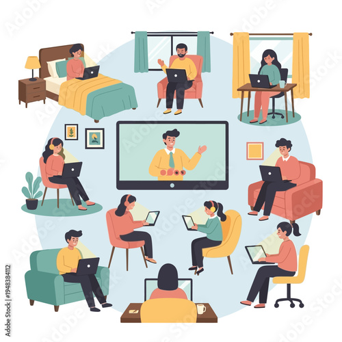 Vektorová ilustrace podnikatelů prezentujících, účast na konferenci, přestávka na kávu, podpis smlouvy, práce na počítači. Office lidé ploché ikony izolované na bílém pozadí