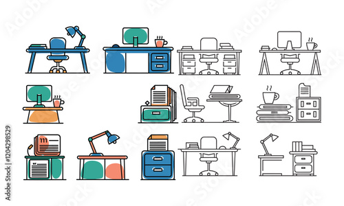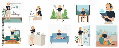 Kancelářská scéna, plochá vektorová ilustrace. Podnikatelé, mužské a ženské postavy pracující na počítačích, cvičení jógy. Kancelářský interiér s moderními pohovkami, vysoký stůl, vizionářská deska.
