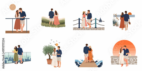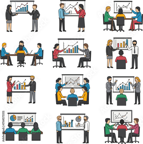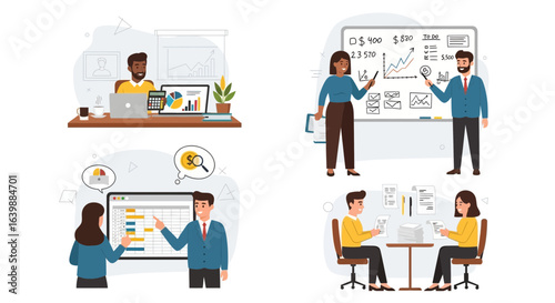 Kancelářská scéna, plochý vektorový izolovaný obrázek. Podnikatelé pracující na počítači, přestávka na kávu, prezentace, setkání, školení, plánování své práce. Kancelářské situace.