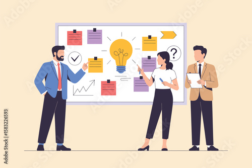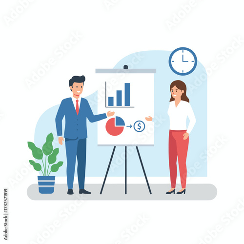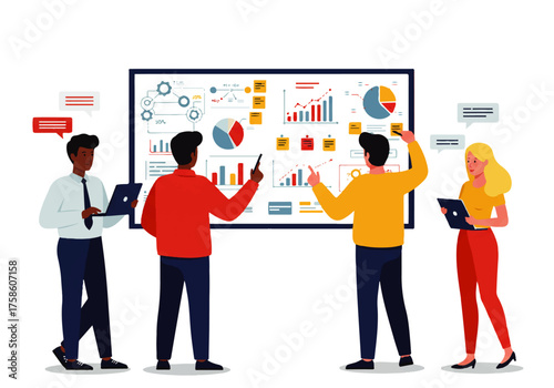 Kancelářská scéna s analytiky podnikatelů pracujícími na řídicím panelu počítačové budovy, analýza statistik, plochá vektorová ilustrace. Analýza velkých dat, analytika, situace v kanceláři.