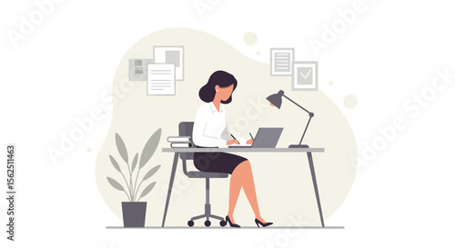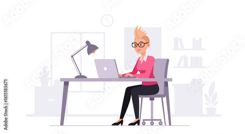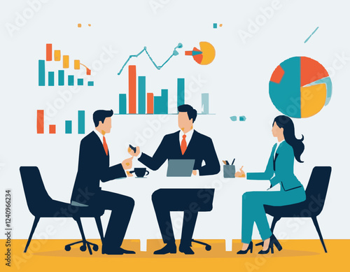 Kancelářská scéna s moderním pracovištěm, dvě obchodní kolegyně, které si dávají přestávku na kávu a mluví k sobě, vektorová plochá ilustrace. Pracovní plán, čas oběda, situace v kanceláři, řízení času.
