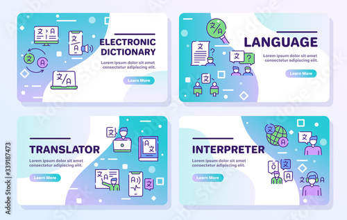 Vektorová sada horizontálních bannerů s kancelářským týmem, cílem a komunikací moderní linie umění plochého stylu designových prvků, webové šablony.