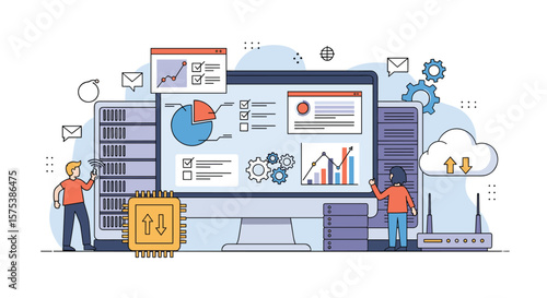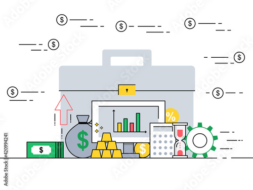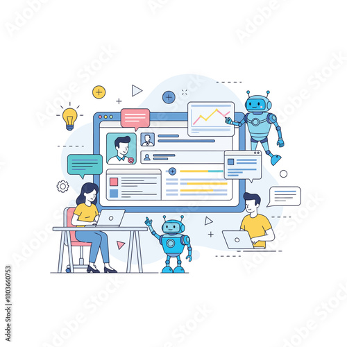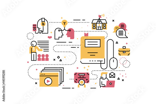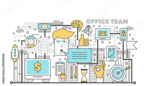 Vektorová ilustrace konceptu kancelářského týmu. Moderní tenký plochý designový prvek se symboly obchodní týmové práce pro webové bannery a tištěné materiály.