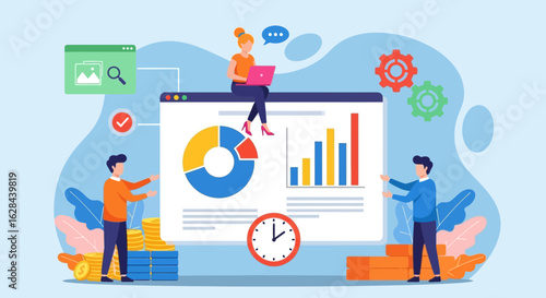Obchodní muž lezení rostoucí sloupcový graf na trofej pohár, žena pracuje na notebooku, vektorový plochý styl designu ilustrace. Kancelářská práce, koncept obchodní kariéry pro webový banner, webovou stránku atd.