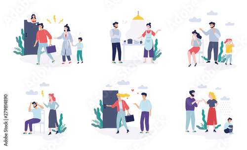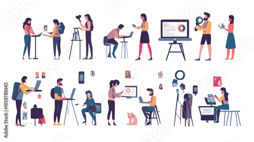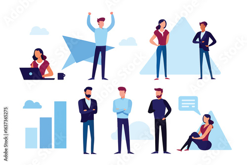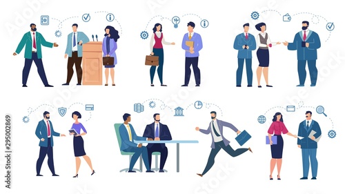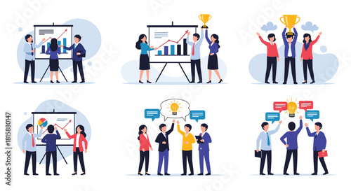 Pracovníci mužské a ženské postavy v různých kancelářských situacích, vektorové ploché izolované ilustrace. Podnikatelé pracující na přenosných počítačích, prezentace, diskuse, brainstorming