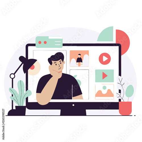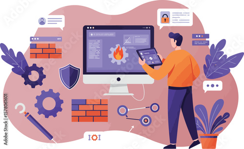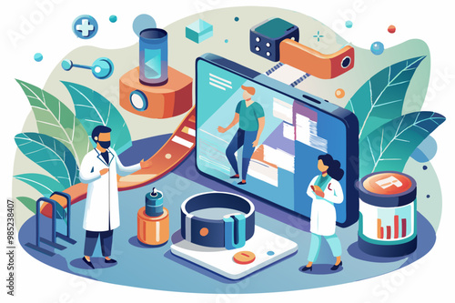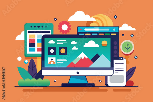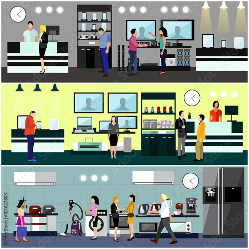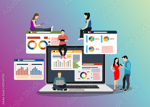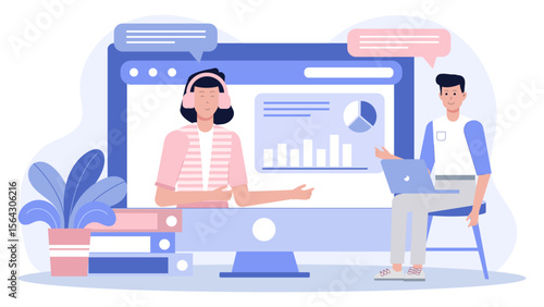 Kancelářské práce vektorové plakát šablony. Obrovský smartphone, počítač s pracovištěm, grafy na obrazovkách, setkání kancelářských lidí, potřesení rukou, práce na přenosném počítači, ilustrace designu plochého stylu.