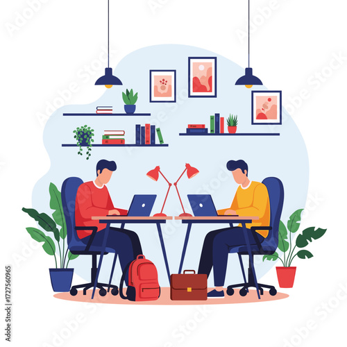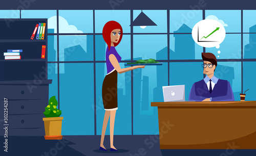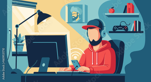 Moderní kancelářské pracoviště. Busy obchodní muž sedí u stolu, pracuje na počítači a pomocí mobilního telefonu, ploché vektorové ilustrace. Pracovní prostor, kancelářská práce.