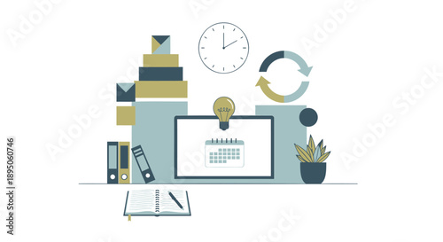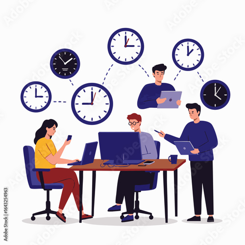 Pracovní prostor, vektorový plochý design ilustrace. Kancelářské pracoviště s postavami spolupracujícími. Softwaroví inženýři, pracovní stanice programátorů, proces kódování a programování, týmová spolupráce.