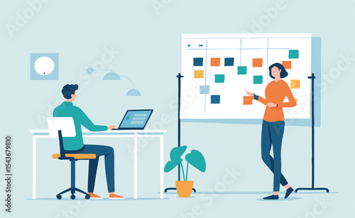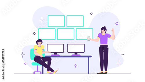 Pracovní prostor, vektorový plochý design ilustrace. Kancelářské pracoviště s postavami pracujícími a odpočívajícími. Pracovní stanice pro vývojáře softwaru, koncept týmové práce pro webový banner, webovou stránku atd.