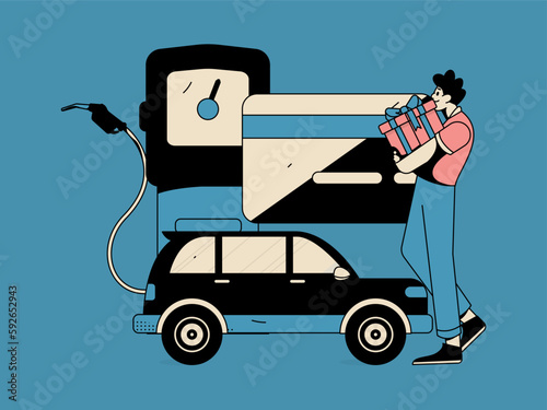 Produkce ropy vektorové ploché ilustrace. Ruka s automatickou palivovou tryskou, olejovou pumpou, sudem, rafinérií, autem. Výroba benzínu a nafty, koncept ropného průmyslu pro webový banner, webovou stránku atd.