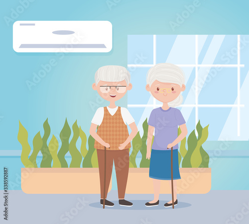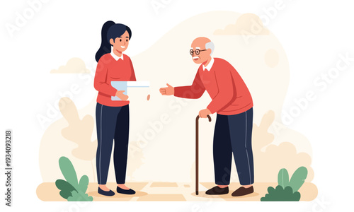 Staří lidé a pečovatelé kreslené postavičky izolované scény set. Dobrovolníci a sociální pracovníci pomáhají starším mužům a ženám každodenní rutinní činnosti vektorové ilustrace