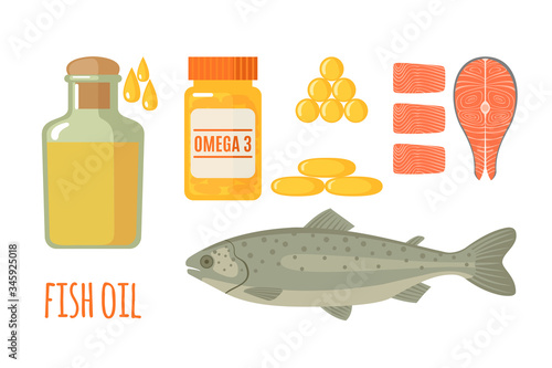 Vektorové realistické omega-3 mastné kyseliny plastová láhev balení maketa, lososově červená ryba, zlato vitamin softgel pilulky a kapky. Omega 3 rybí olej doplněk reklamní plakát design šablony.