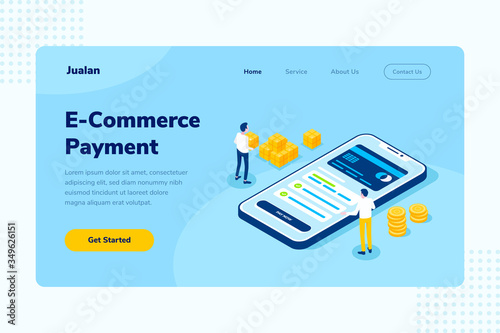 Online banka vstupní stránka webové stránky šablony. Vektorový izometrický smartphone s bankovní aplikací. Koncept mobilního bankovnictví a internetových plateb.