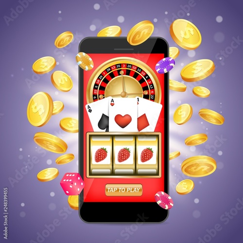 Online kasino vektorové plakát banner design šablony. Smartphone, Ruleta, Hrací karty, výherní automat, pokerové žetony, kostky, zlaté dolarové mince. Mobilní, pohybliví sloty a kasinové hry.