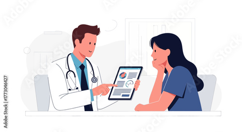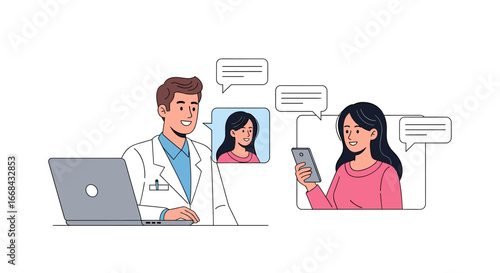 Online lékař pomáhá pacientce z obrazovky počítače, ploché vektorové ilustrace. Vzdálená lékařská konzultace, telemedicína.