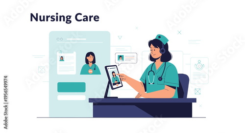 Online lékař pomáhá pacientce z obrazovky počítače, ploché vektorové ilustrace. Vzdálená lékařská konzultace, telemedicína.