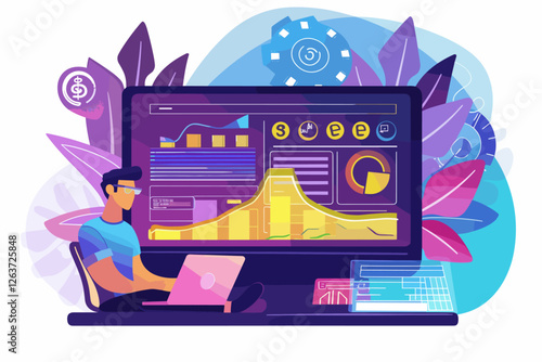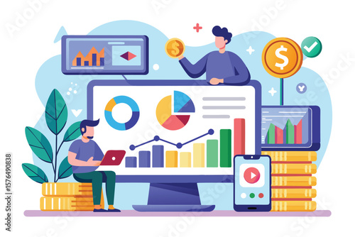 Lidé vkládají peníze do dárcovské krabice uvnitř obrazovky počítače, vektorová plochá ilustrace. Online darování charitativní fundraising koncept pro web banner, webové stránky atd.