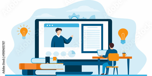 Online vzdělávání a školení, koncept vektorové ilustrace. Technologie digitální knihovny. Online kurz, video webinář.