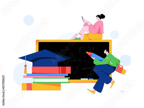 Vektorová ilustrace velké promoční akademické čepice a malých lidí, kteří používají notebooky, zatímco sedí na ní a vedle ní. Online vzdělávání, koncept e-learningového procesu pro webový banner, webová stránka.