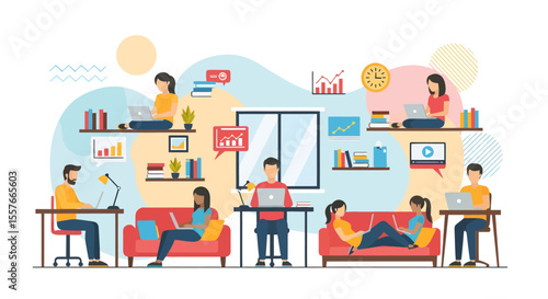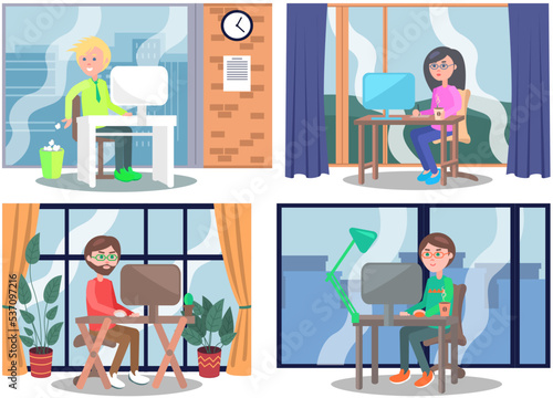 Online setkání přátel, vektorové ploché ilustrace. Šťastní lidé komunikují mezi sebou pomocí připojení k internetu a notebooku. Technologie videokonferencí, Skupinový videochat, virtuální párty.