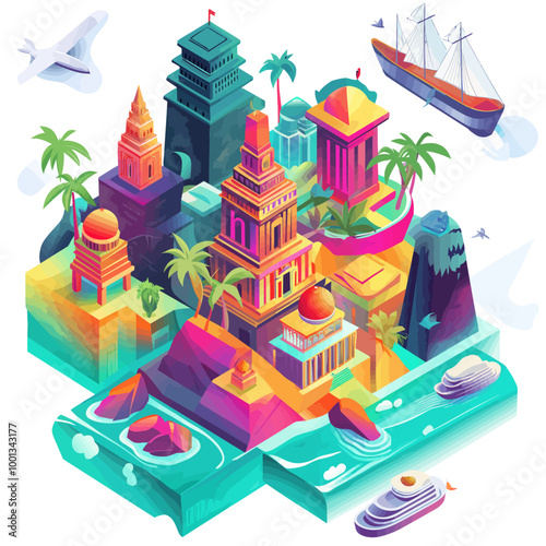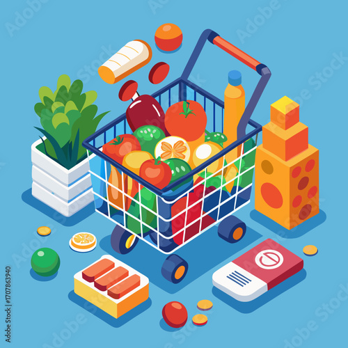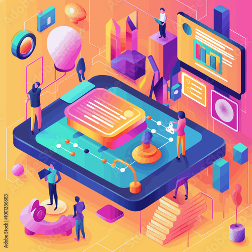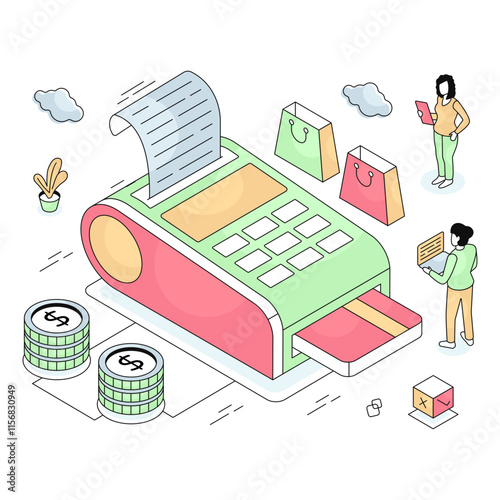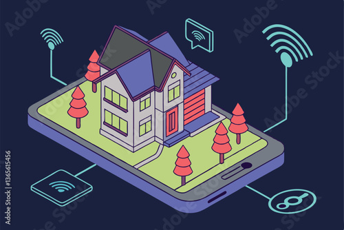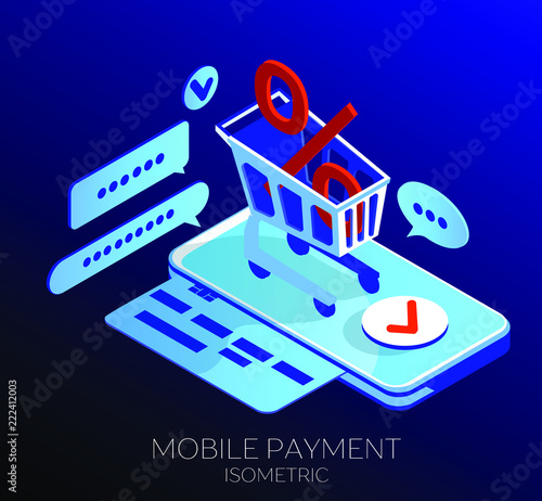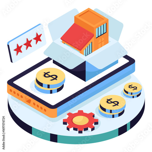 Online hotel booking koncept vektorové ploché izometrické ilustrace. Budova hotelu a vrátný se zavazadly na obrazovce smartphonu.