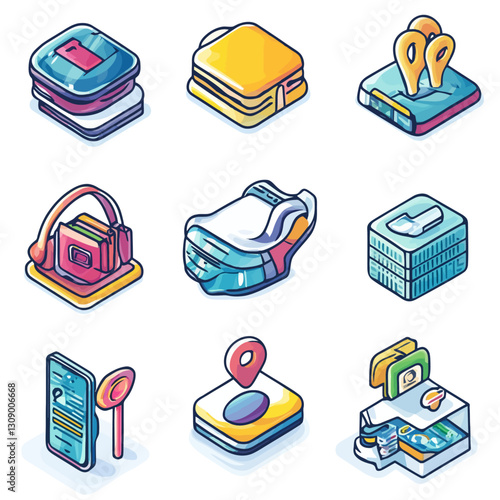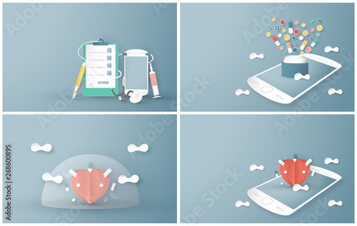 Online lékařské služby vektorové ploché izometrické plakát set. Online klinická konzultace, monitor srdečního tepu, připomenutí léků, prvky konceptu nouzového upozornění pro webové bannery, tisk, infografika