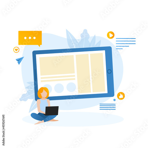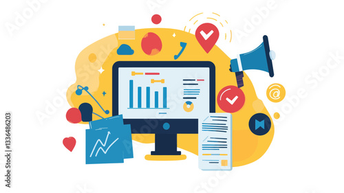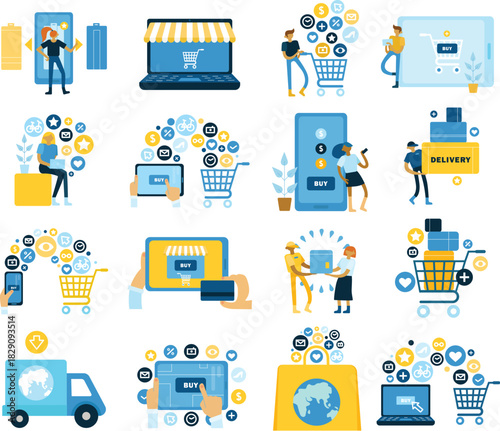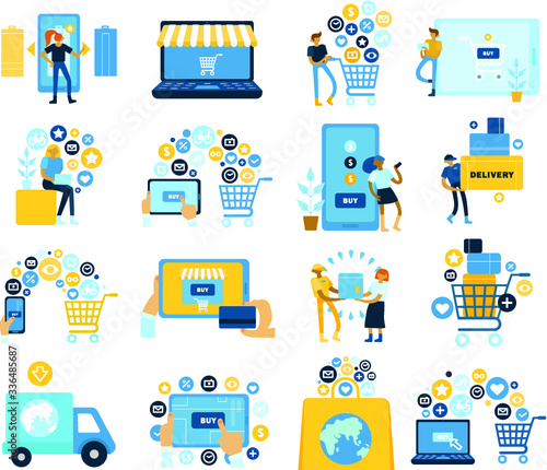 Online mobilní nákupní koncept. Vektorová ilustrace v designu plochého stylu. Smartphone s nákupními ikonami, bankovní kartou, nákupním košíkem, doručovací službou. Platba na internetu.