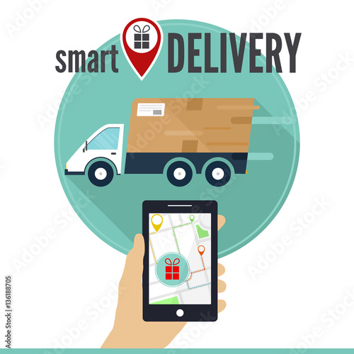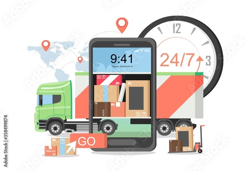 Dodávka a mobilní telefon s kartonovými krabicemi, balíčky na obrazovce, vektorová plochá ilustrace mapy světa. Online doručení, mezinárodní přepravní služba, online služba sledování objednávek.
