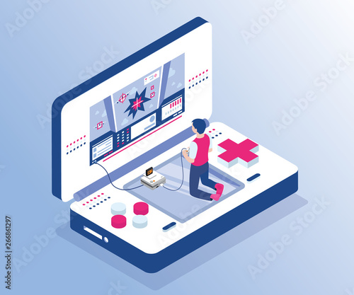 Online drogerie, ploché vektorové ilustrace. Izometrická obrazovka smartphonu s pultem lékáren, lékaři lékárníci sloužící pacientům, lahvičky s léky, pilulky na policích. Online lékárna aplikace.