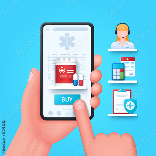 Online telefon aplikace pro lékařskou pomoc vektorové ilustrace. Aplikace Smartphone pro objednávku a nákup léků. Nouzový telefon v lidské ruce s designem lékárničky