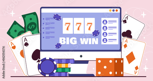 Online poker koncept vektorové ilustrace. Počítač s virtuálním pokerového stolu na obrazovce monitoru, karban čipy, karty, dolarové mince, kabelka s papírovými penězi, brýle. Internet casino poker plakát banner