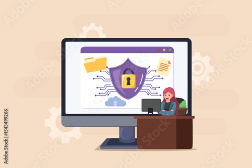 Online poker, vektorový plochý styl designu ilustrace. Internet poker kasino karban koncept s malými postavami hráčů a velký počítačový monitor s hracími kartami na obrazovce.