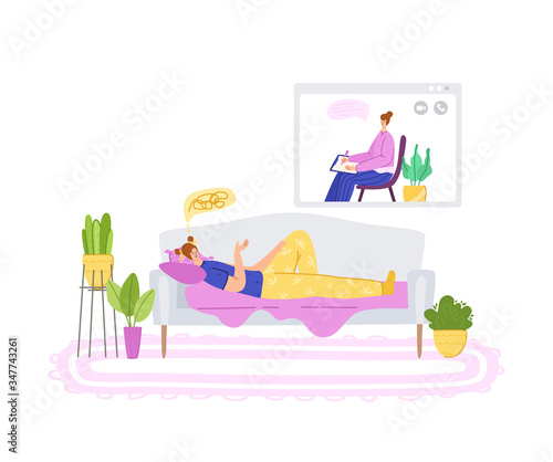 Online služba psychologické pomoci, vektorové ploché ilustrace. Psychoterapeutické sezení s profesionálním online poradcem psychoterapeut poradenství pacientka žena má emocionální, rodinné problémy atd.