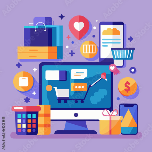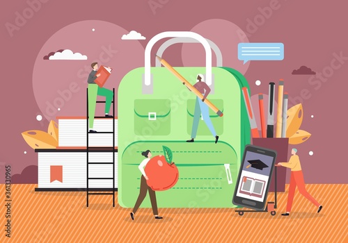 Online vzdělávání, vektorové ploché ilustrace. Malé postavy studenti stojící na obrovském batohu, žebřík drží knihu, tužku, tlačí vozík s mobilem. Distanční vzdělávání, e-learning, dálkové vzdělávání.